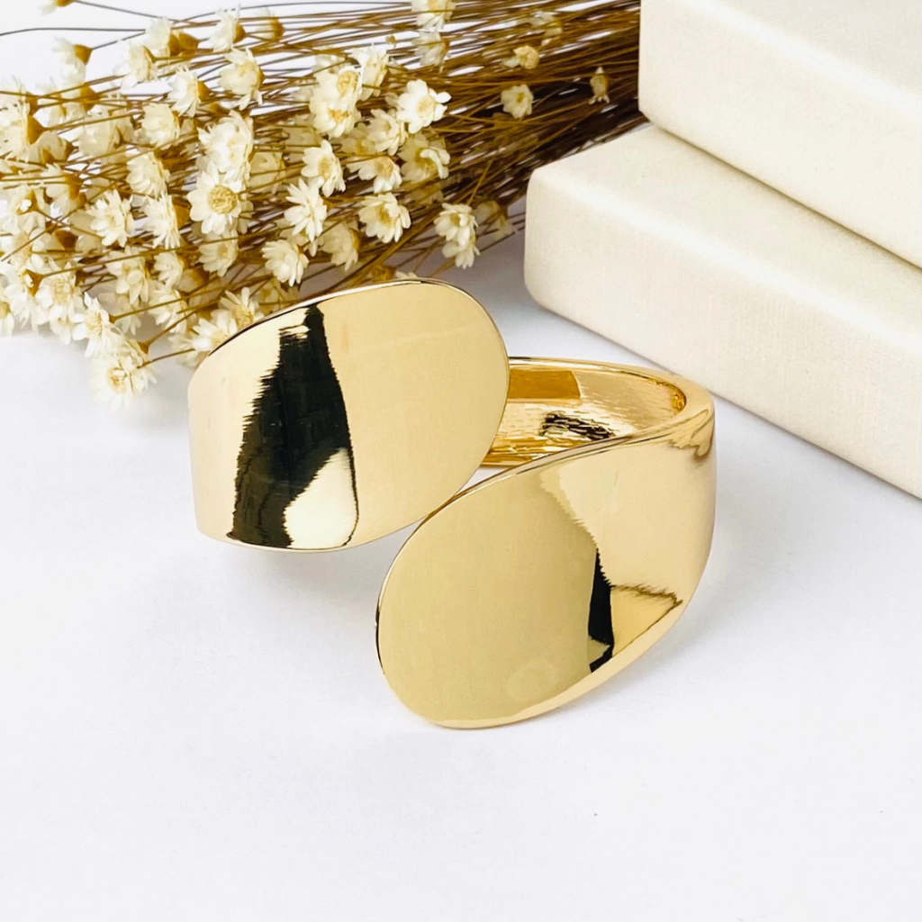 Bracelete metal de design perpendicular em formato orgânico com superficie espelhada. Esta peça com design delicado combina sofisticação e praticidade, oferecendo um toque de elegância que se adapta perfeitamente a qualquer ocasião. Disponível nos acabamentos folheado a ouro 18k e ródio branco, é a escolha ideal para quem deseja um acessório atemporal, que transita com facilidade entre o dia a dia e eventos especiais.