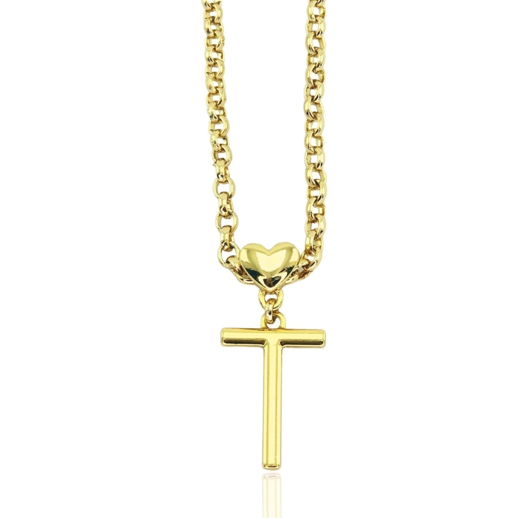 Colar na corrente elo português com pingente em formato de letra (inicial) com coração passante pequeno e delicado, disponível em diferentes variações no banho ouro 18K na semijoia verniz italiano.
