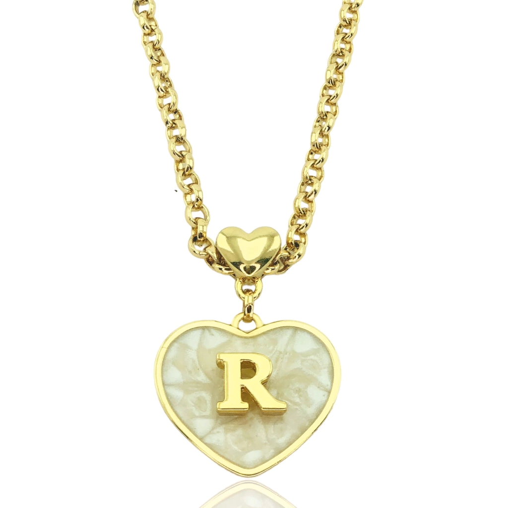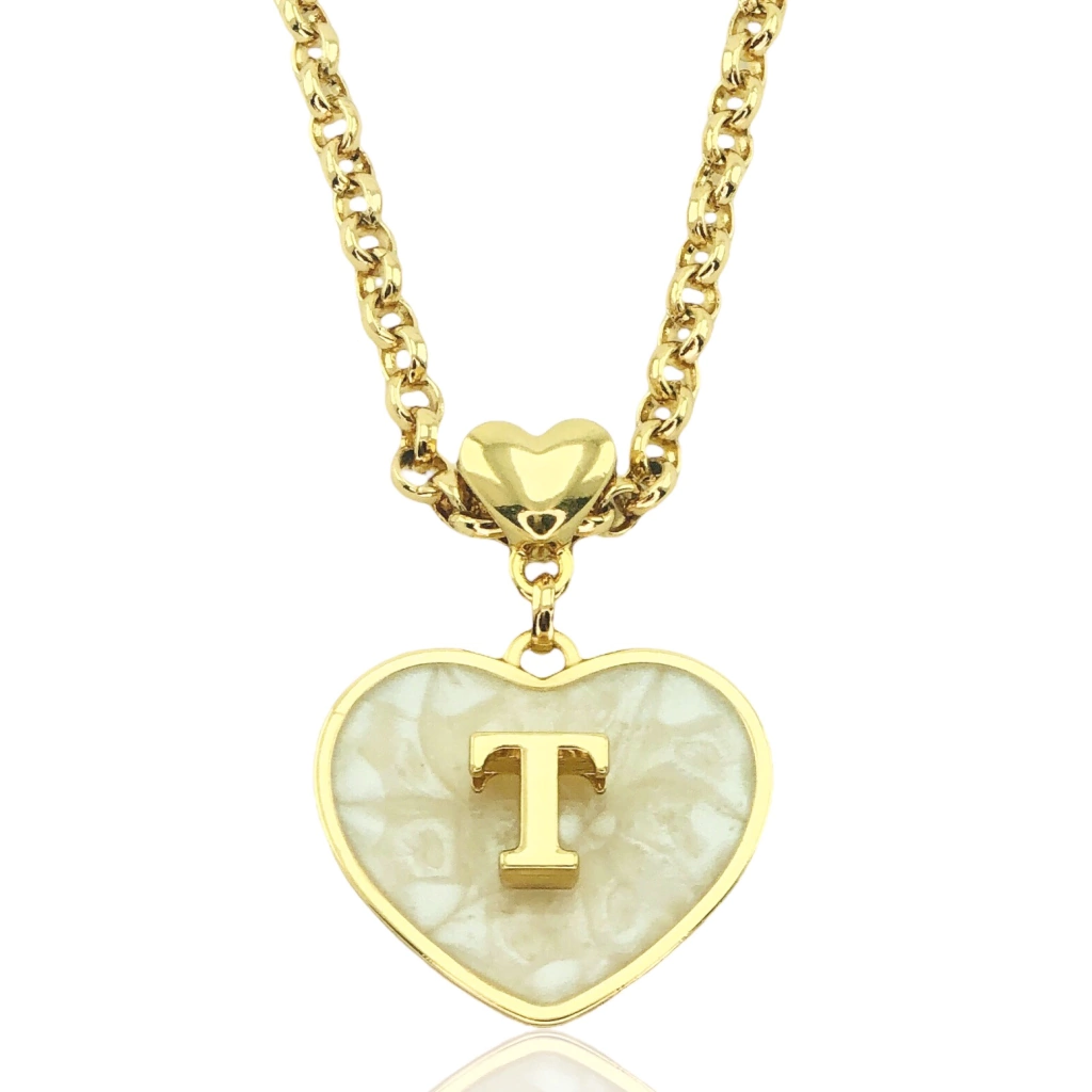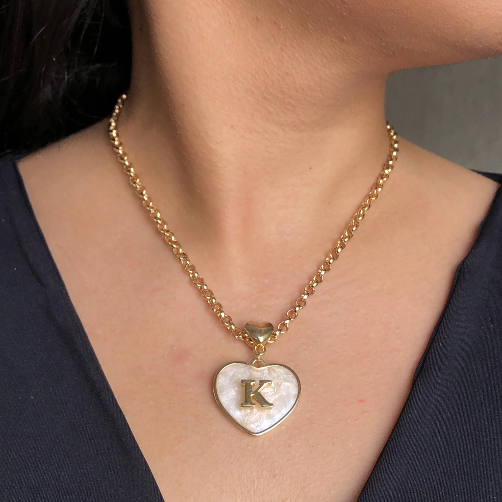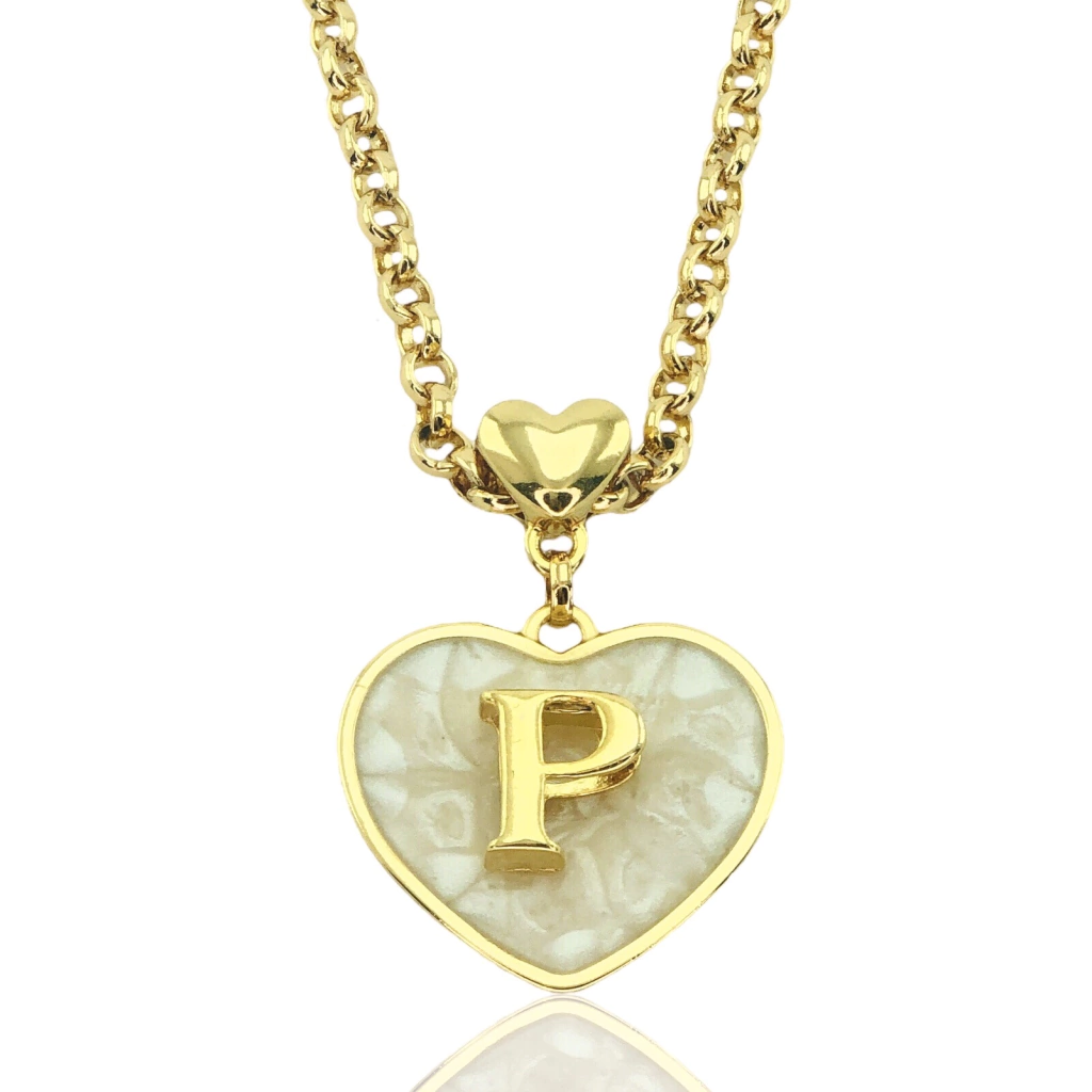 O colar na corrente elo português com passador de coração apresenta silhueta em formato de coração resinado em madrepérola com inicial, banhado a ouro 18K com camada de verniz na semijoia italiana. Use-o como um lembrete da sua personalidade feminina sofisticada e delicada ou o dê de presente para alguém especial.